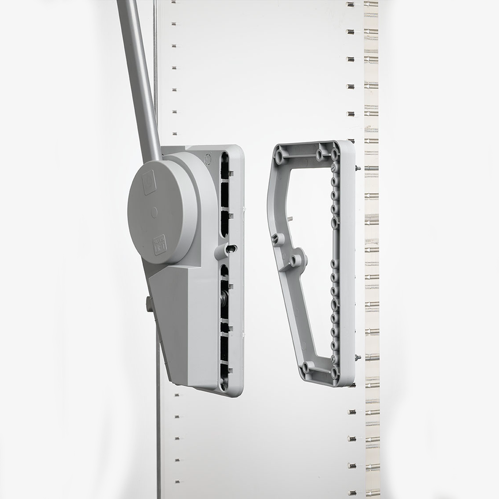 Gardırobun farklı derinliklerine göre kol eğimini değiştirmek mümkündür. Mekanizmanın üzerini kaplayan plastik bir kaplama, büyük oranda çelikten yapılmış ve görünürde hiçbir vida bulunmuyor. Montajı oldukça basittir: Tamamen Sistem 32 delme yöntemiyle yapılır, gardırobun yan tarafına ilave delik açılmasına gerek yoktur. Özel sac braketler (opsiyonel) kullanılarak duvara veya giyinme odalarının iç kısmına da uygulanabilir.