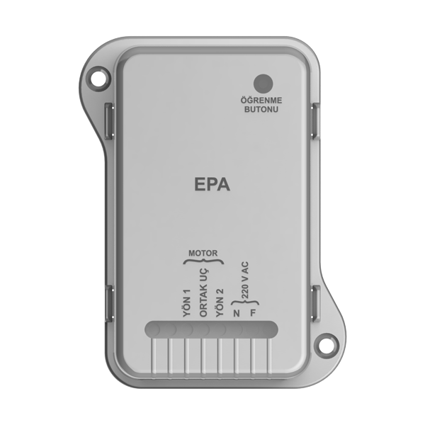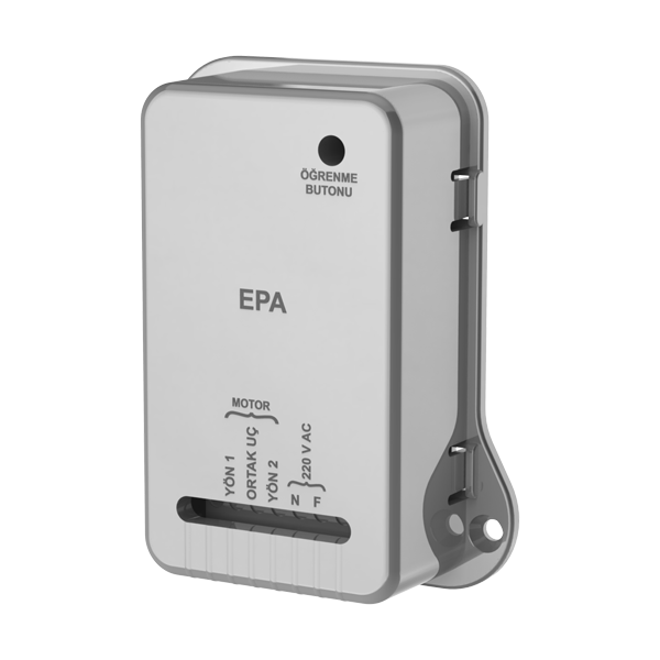 EPA panjur açıcı, firmamıza ait EVS3 serisi kumandalarla çalışan motor sürücü kartıdır. Panjur ve kepenk sistemlerinde kullanılan 2 yönlü 3 uçlu (Yön1, Yön2, Ortak Uç) motorların kumandalı olarak kontrol edilmesi için kullanılmaktadır